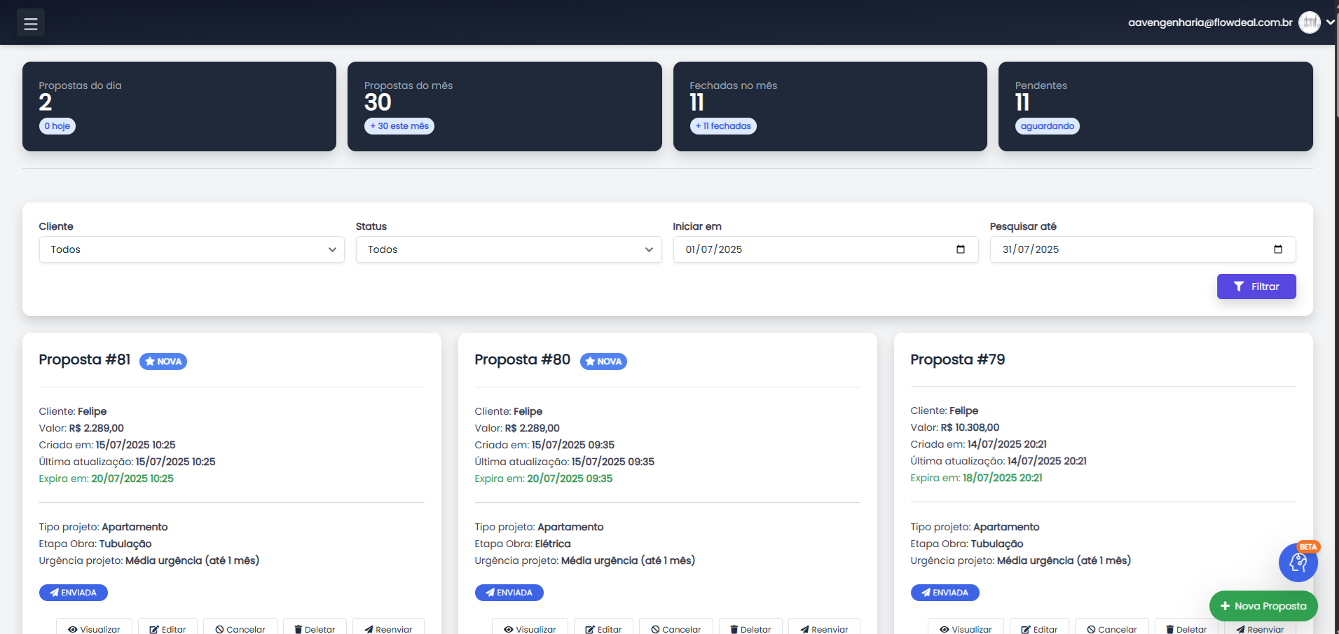 Você envia a proposta direto para o email do cliente. Recebe notificações se ele visualizou a proposta, aceitou ou recusou.